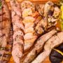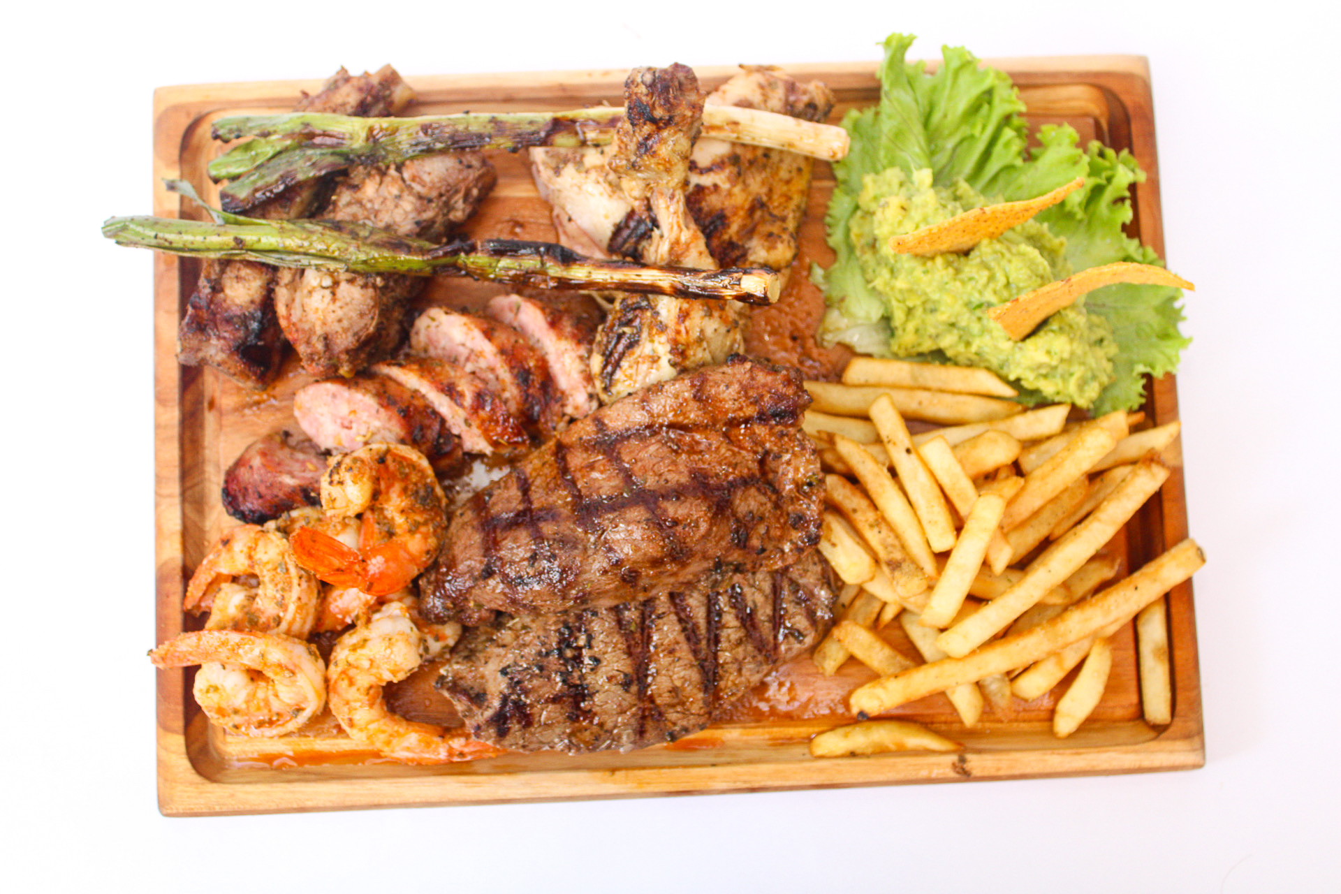 12 onzas de puyazo americano, ½ libra de chorizo argentino, 6 camarones grandes, ½ libra de costilla marinada, ½ libra de pollo, frijoles volteados de la casa, guacamole, nachos y tortillas.