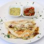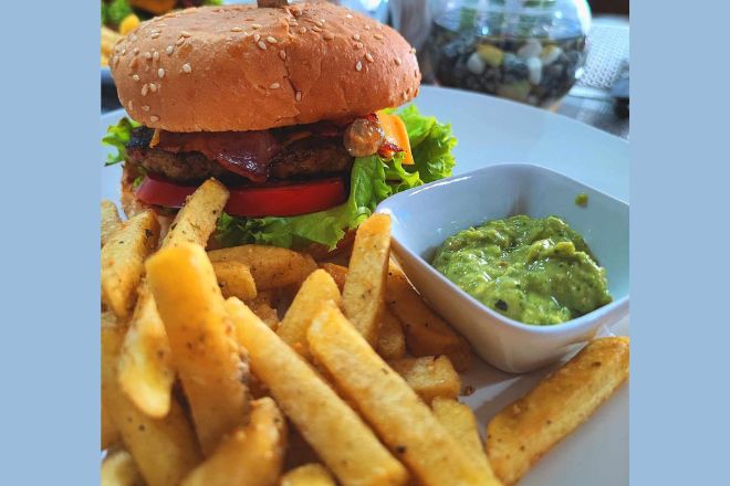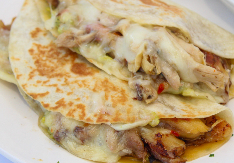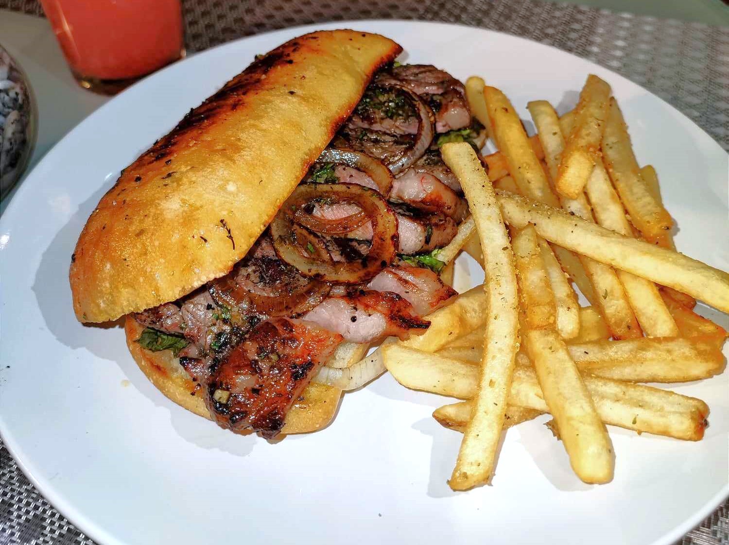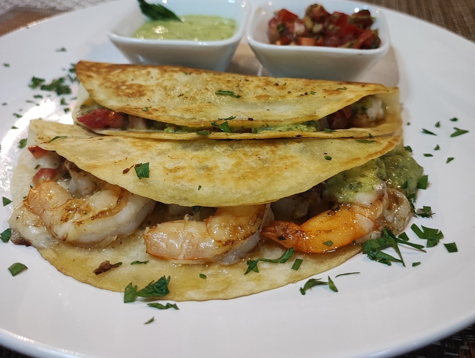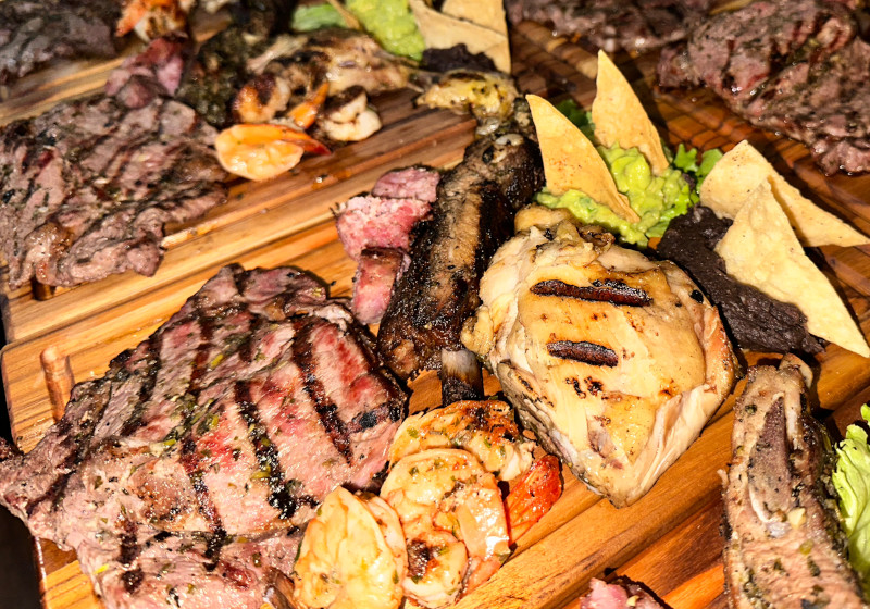 12 onzas de steak de casa, 6 camarones grandes, ½ libra de chorizo argentino, ½ libra de pollo, frijoles volteados de la casa, guacamole y tortillas.