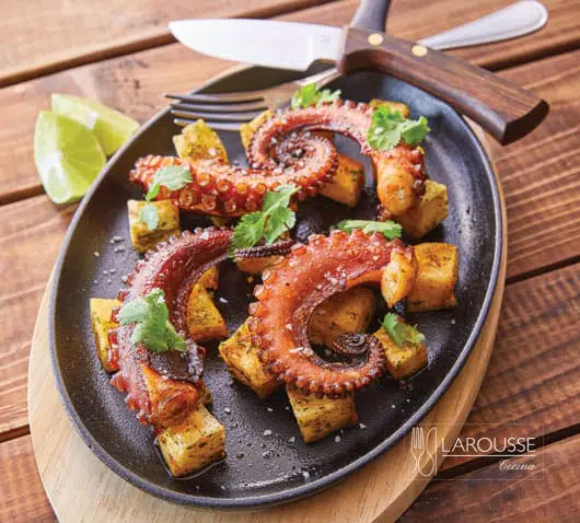 Pulpo salteado en una deliciosa mezcla de ajo y aceite de oliva, con un toque de especias que realzan su sabor único.